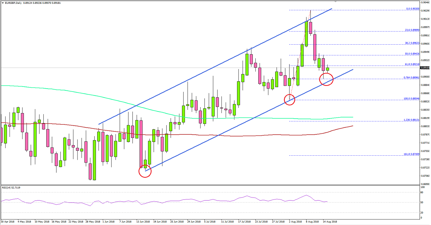 The Euro climbed higher this past week and broke the 0.8950 resistance against the British Pound. The EUR/GBP pair even broke the 0.9000 level before finding sellers near the 0.9030 level.EURGBP Technical Analysis Euro British PoundLooking at the daily chart, the pair formed a short-term top near the 0.9030 level and started a downside move. It dropped below the 0.8950 support and the 50% Fib retracement level of the last wave from the 0.8854 low to 0.9030 high.However, the pair remains well supported above the 0.8880-0.8900 zone. More importantly, there is a crucial ascending channel in place with support at 0.8900 on the same chart.The pair is also trading well above the 0.8800 pivot level and the 100-day simple moving average (red). Therefore, as long as the pair is above the 0.8880 support zone, it could resume its upside below.On the other hand, a break below the ascending channel and the 0.8880 support could drift the pair towards the 0.8800-0.8810 support zone.On the upside, an initial resistance is near the 0.8960 level, above which, the price could revisit the 0.9000 resistance area.Recently, the Euro Area Gross Domestic Product reading for Q2 2018 (Prelim) was released by the Eurostat. The market was looking for a 0.3% growth in the GDP in Q2 2018 compared with the previous quarter.However, the result was better as the Euro Area’s seasonally adjusted GDP rose by 0.4%. The yearly change was +2.2%, more than the forecast of 2.1%.The result was positive, but it failed to help the EUR/USD pair as it stayed below the 1.1420-1.1430 resistance. Moreover, the GBP/USD pair struggled to break the 1.2820 resistance and remained in a bearish zone.