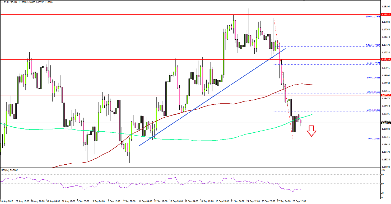The Euro traded towards the 1.1780-1.1800 resistance this past week against the US Dollar. The EUR/USD pair failed to clear the 1.1800 resistance and started a sharp downside move.
