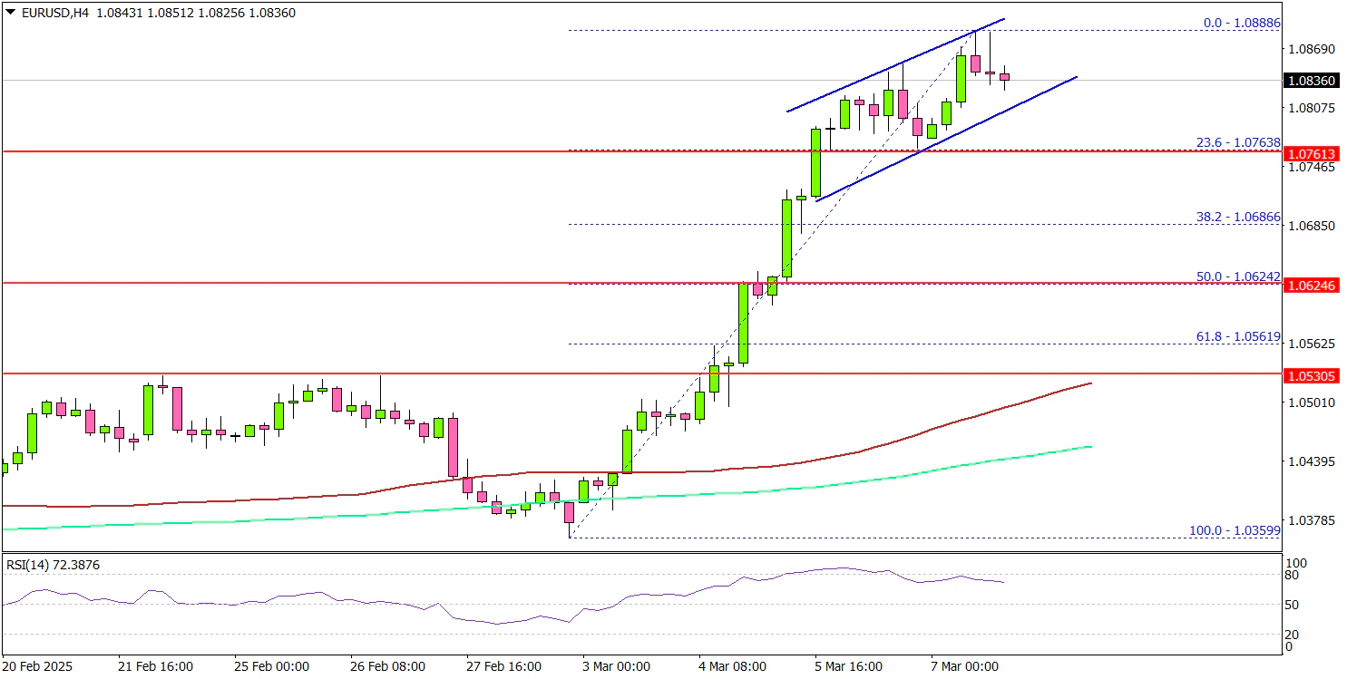 The main resistance is now forming near the 1.0950 zone. Any more gains might send the pair toward the 1.1000 zone. On the downside, immediate support sits near the 1.0800 level. There is also a short-term rising channel with support at 1.0800 on the same chart.