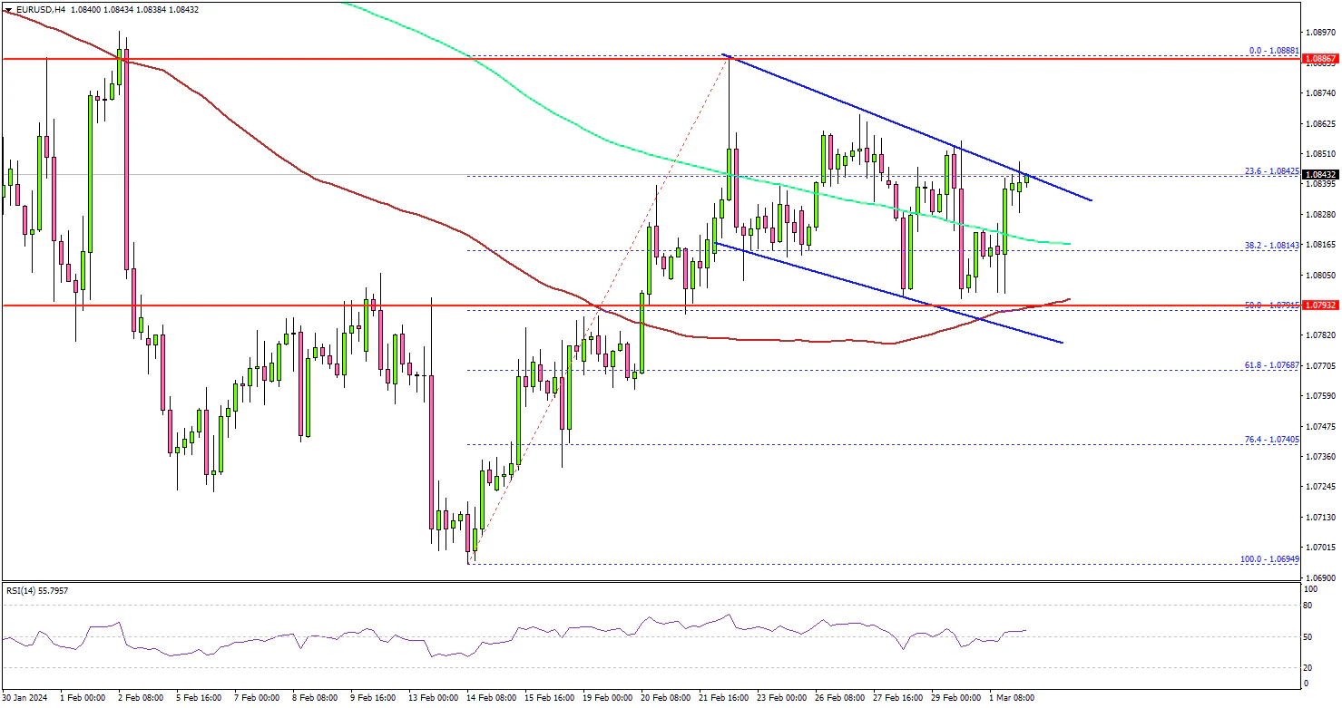 Looking at the 4-hour chart, the pair settled above the 1.0800 level, the 100 simple moving average (red, 4-hour), and the 200 simple moving average (green, 4-hour). It is now aiming for more gains above the 1.0850 level.