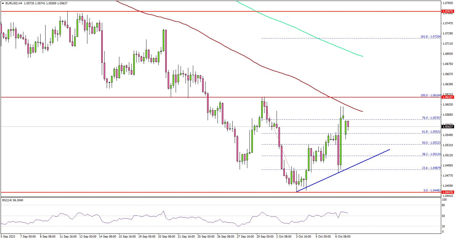 It even tested the 1.0450 zone. A low was formed near 1.0448 and the pair recently started a recovery wave. There was a move above the 1.0500 and 1.0550 resistance levels. It even tested the 1.0600 resistance and the 100 simple moving average (red, 4 hours).
