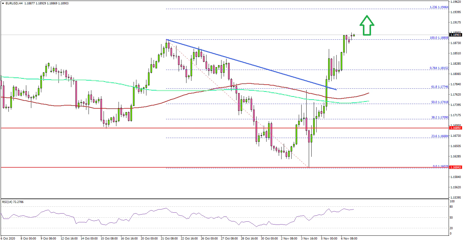 Overall, the US Dollar declined sharply after 2020 US election results. GBP/USD also started a strong rally above 1.3000 and 1.3050. Besides, gold price surged above $1,920 and $1,950 resistance levels.