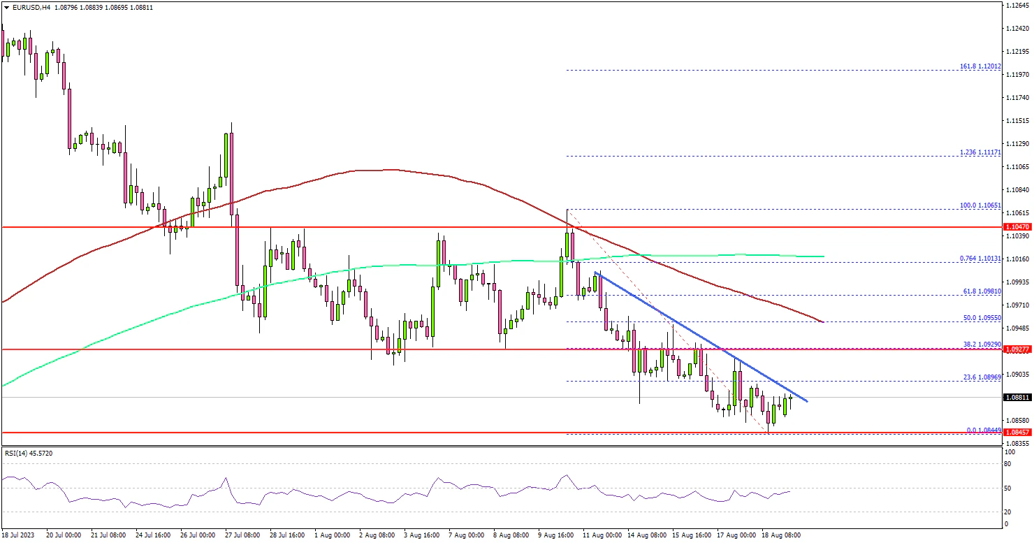 - A key bearish trend line is forming with resistance near 1.0885 on the 4-hour chart.