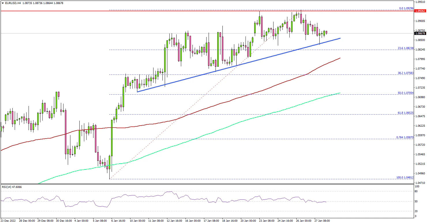 Looking at the 4-hours chart, the pair traded as high as 1.0929 and is currently consolidating in a range. There was a minor decline below the 1.0900 level. However, the pair is trading well above the 100 simple moving average (red, 4-hours) and the 200 simple moving average (green, 4-hours).