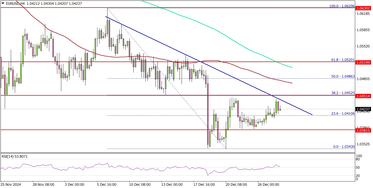 • A major bearish trend line is forming with resistance at 1.0450 on the 4-hour chart.