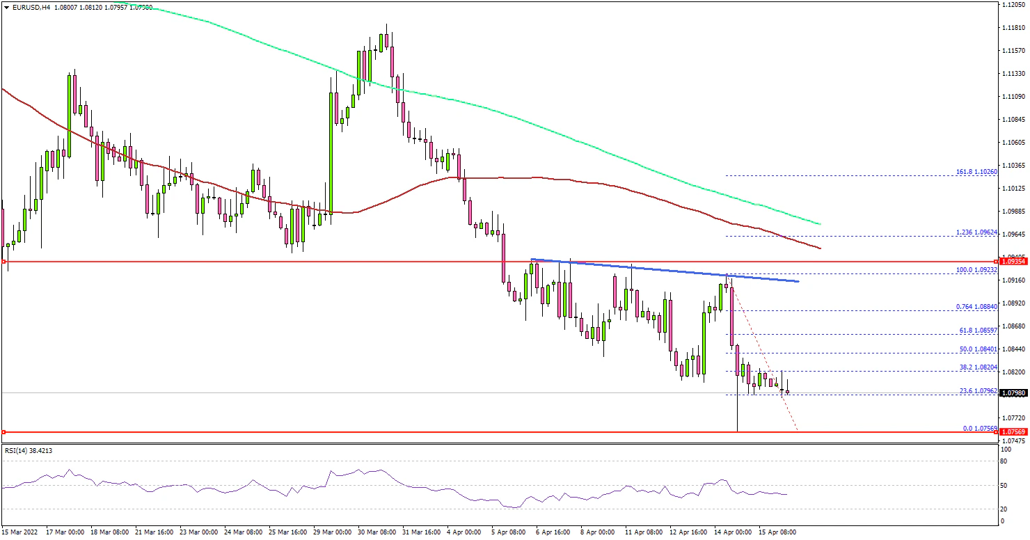 Looking at the 4-hours chart, the pair attempted a recovery wave from the 1.0756 low. However, it stayed below the 1.0850 pivot level, the 200 simple moving average (green, 4-hours), and the 100 simple moving average (red, 4-hours).