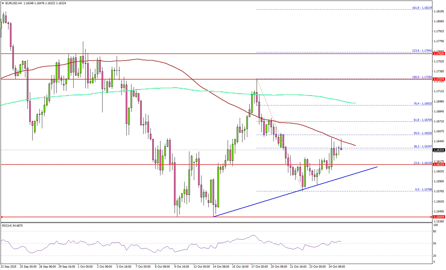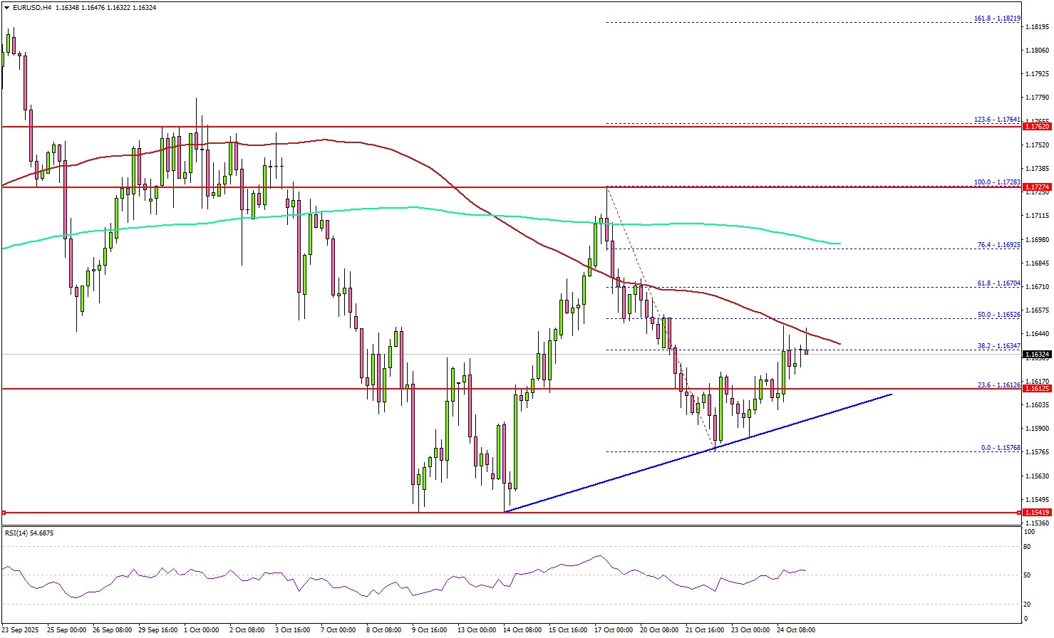 - A short-term bullish trend line is forming with support at 1.1610 on the 4-hour chart.