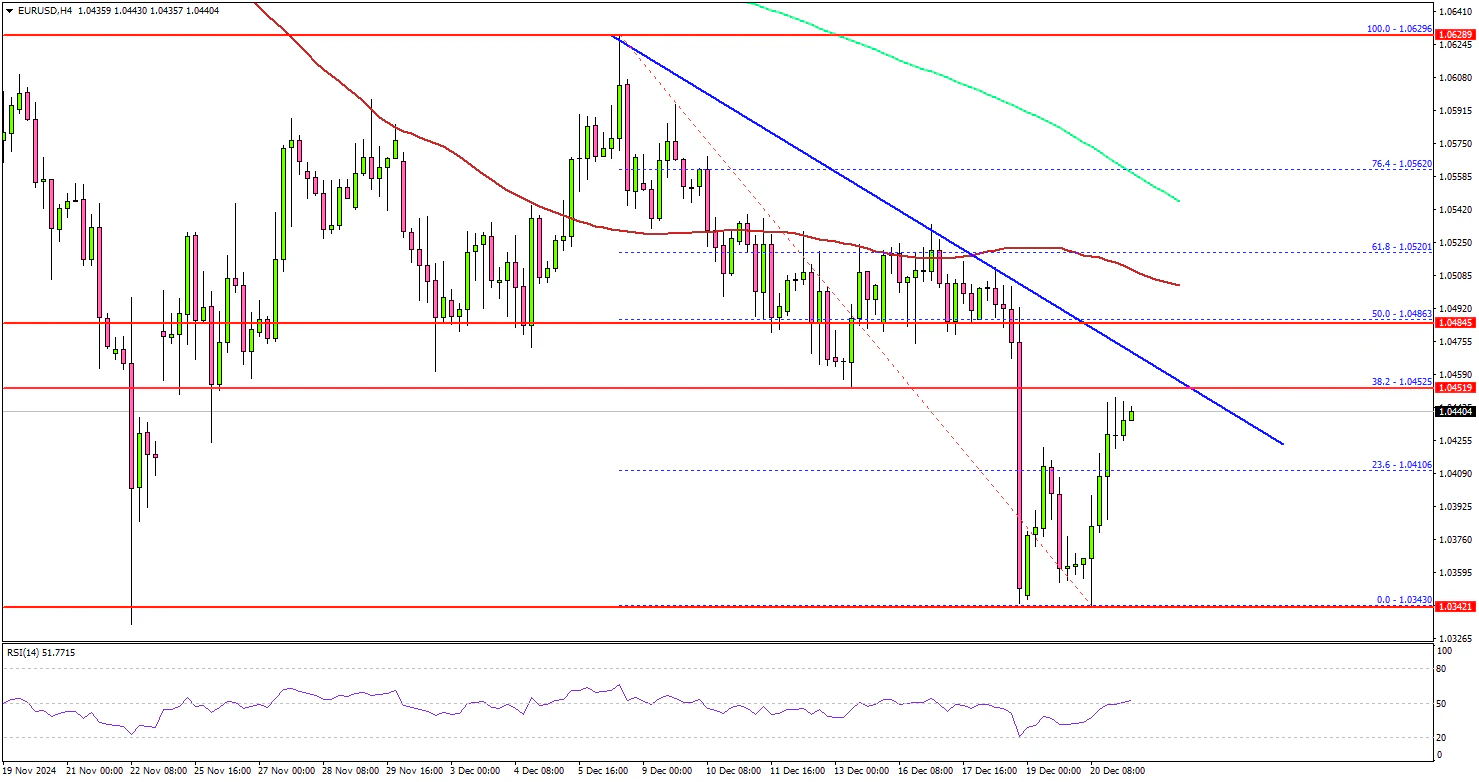 The Euro traded as low as 1.0343 before it started a recovery wave against the US Dollar. EUR/USD climbed above the 1.0380 and 1.0400 resistance levels.