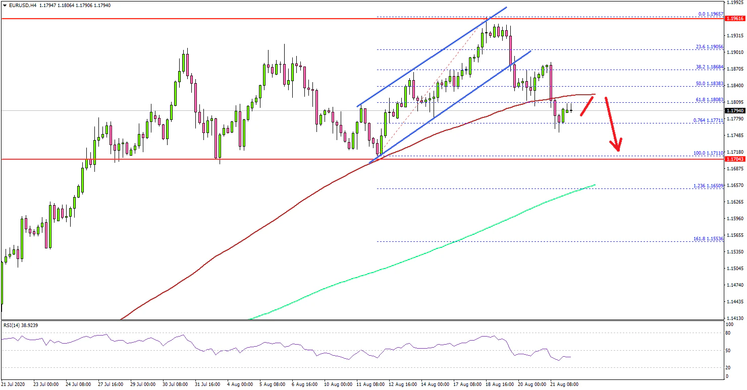 Looking at the 4-hours chart, the pair started a fresh decline from the 1.1965 high and broke the 1.1920 support. There was also a break below a key ascending channel with support near 1.1870.