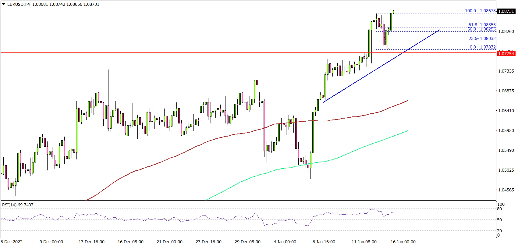 The Euro started a fresh increase above the 1.0750 resistance zone against the US Dollar. EUR/USD broke the 1.0800 resistance to move into a positive zone.