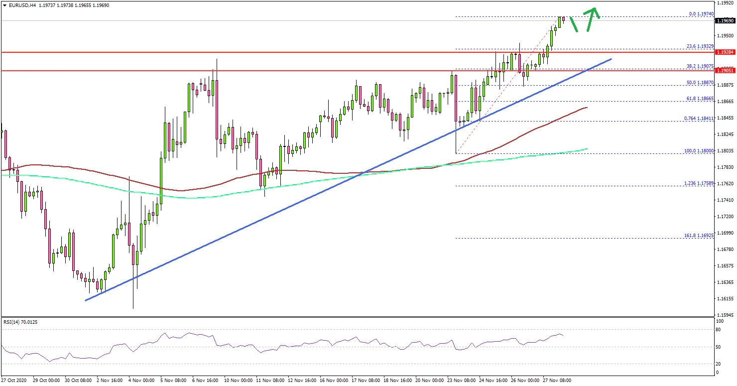 The upward move was such that the pair broke the last swing high and surpassed the 1.1940 resistance. A new monthly high was formed near 1.1975 and the pair is currently trading well above many important supports.