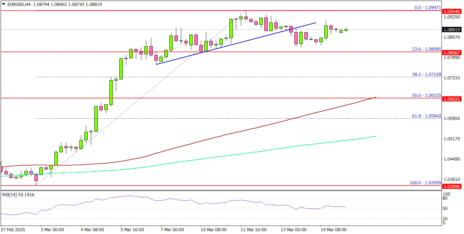Looking at the 4-hour chart, the pair settled above the 1.0800 level, the 100 simple moving average (red, 4-hour), and the 200 simple moving average (green, 4-hour). The pair even tested the 1.0950 zone before it started a consolidation phase.