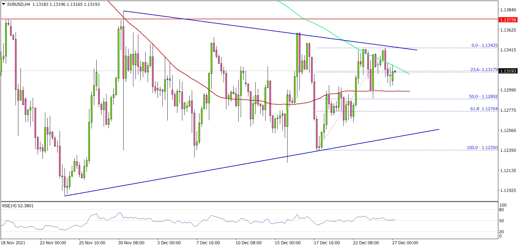 Looking at the 4-hours chart, the pair even broke the 1.1300 level and the 100 simple moving average (red, 4-hours). The pair even spiked above the 200 simple moving average (green, 4-hours), but there was no clear move above the 1.1350 level.