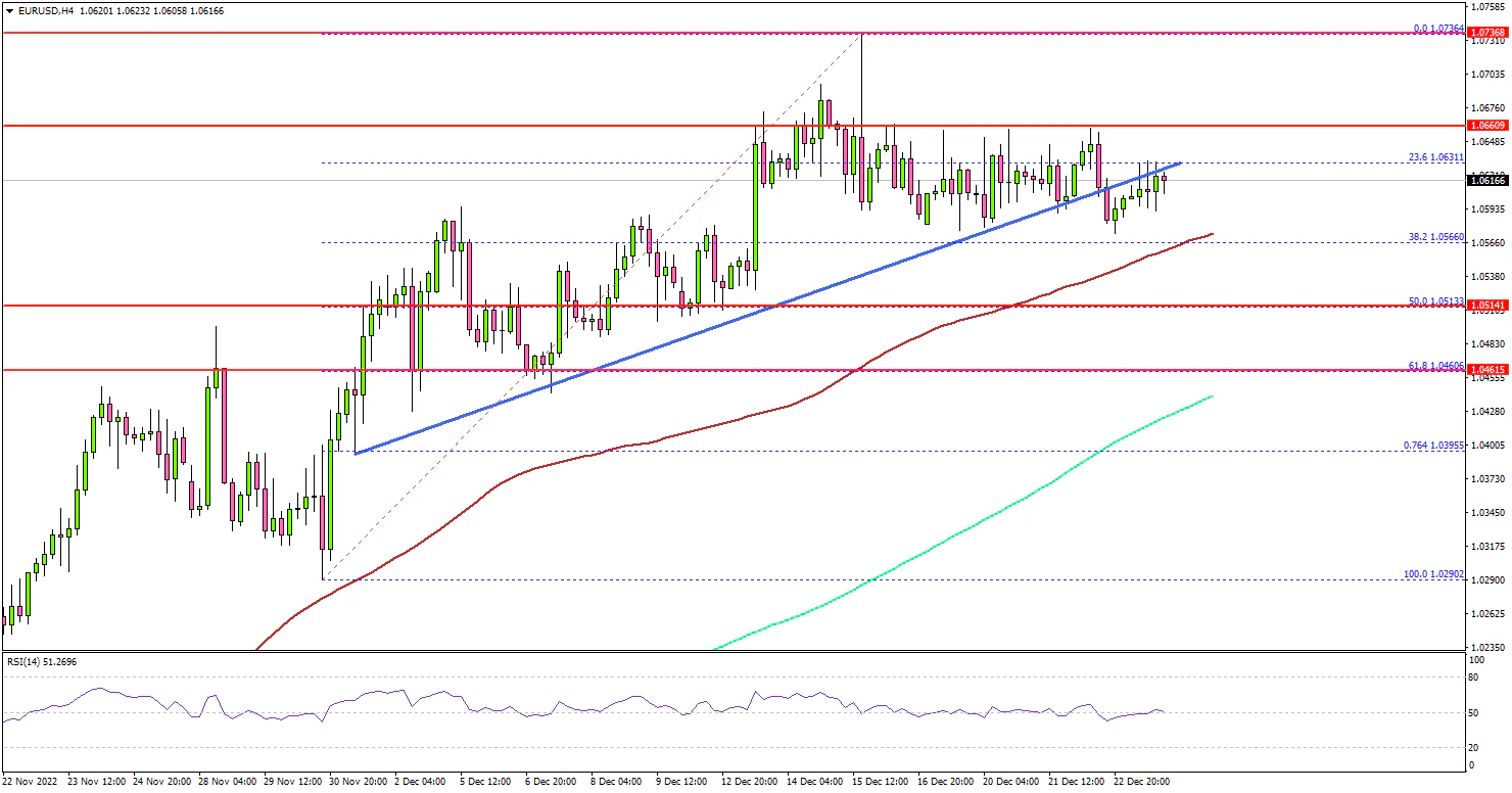 Looking at the 4-hours chart, the pair traded as high as 1.0736 before there was a downside correction. There was a minor decline below the 1.0650 support. There was also a break below a key bullish trend line with support at 1.0605 on the same chart.