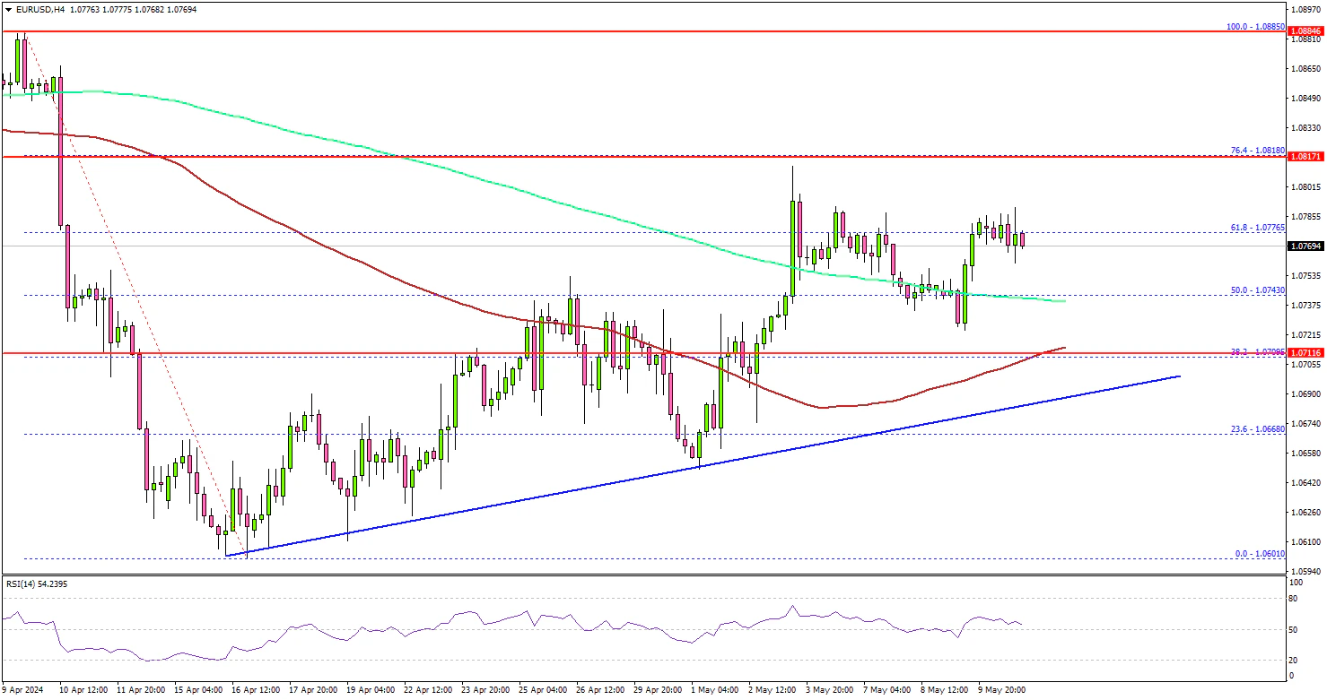 Immediate support is near the 1.0740 level and the 200 simple moving average (green, 4-hour). The next major support is at 1.0720. There is also a key bullish trend line forming with support at 1.0700 on the same chart.