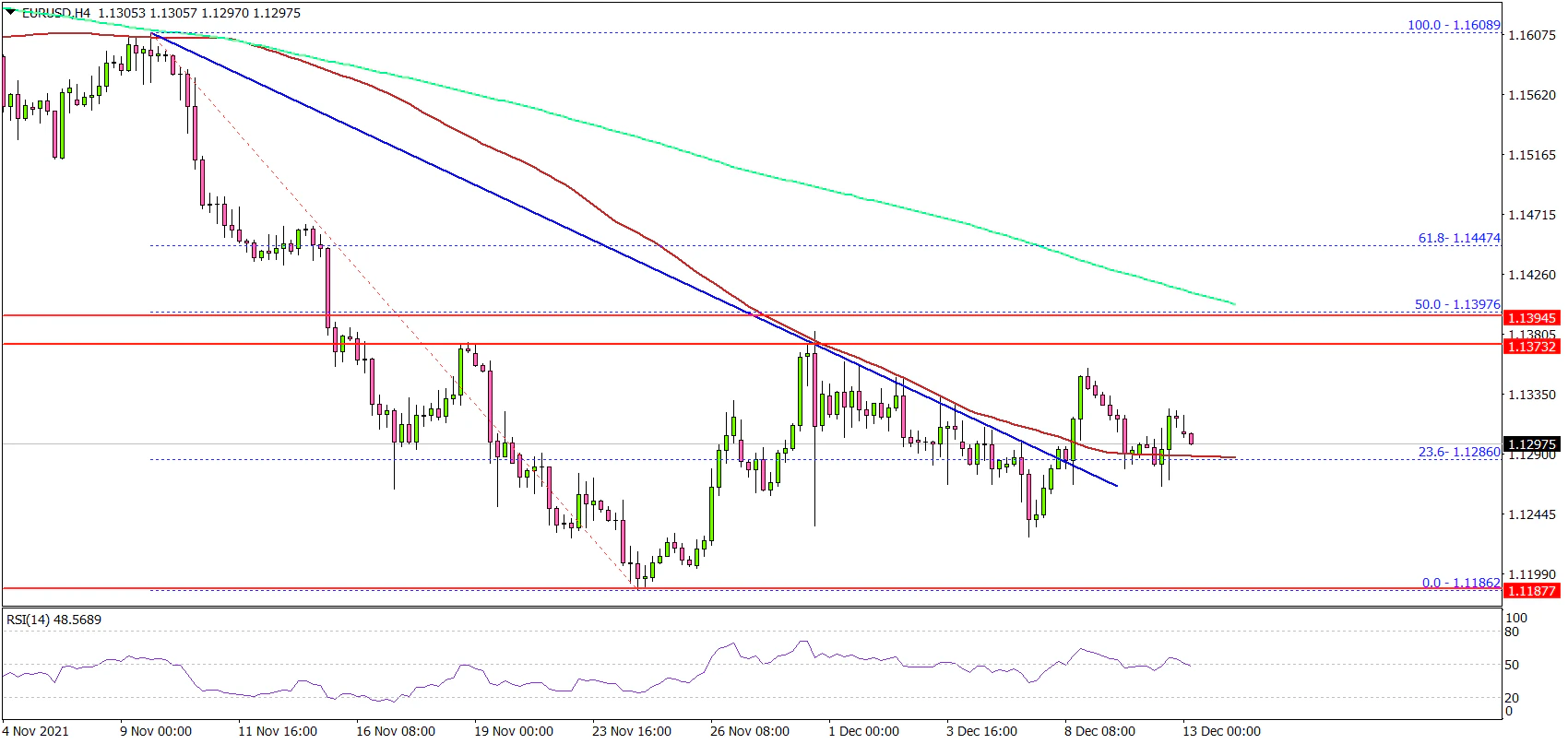 The next key resistance is near the 50% Fib retracement level of the downward move from the 1.1608 swing high to 1.1186 low. The main resistance is near the 1.1400 level and the 200 simple moving average (green, 4-hours).