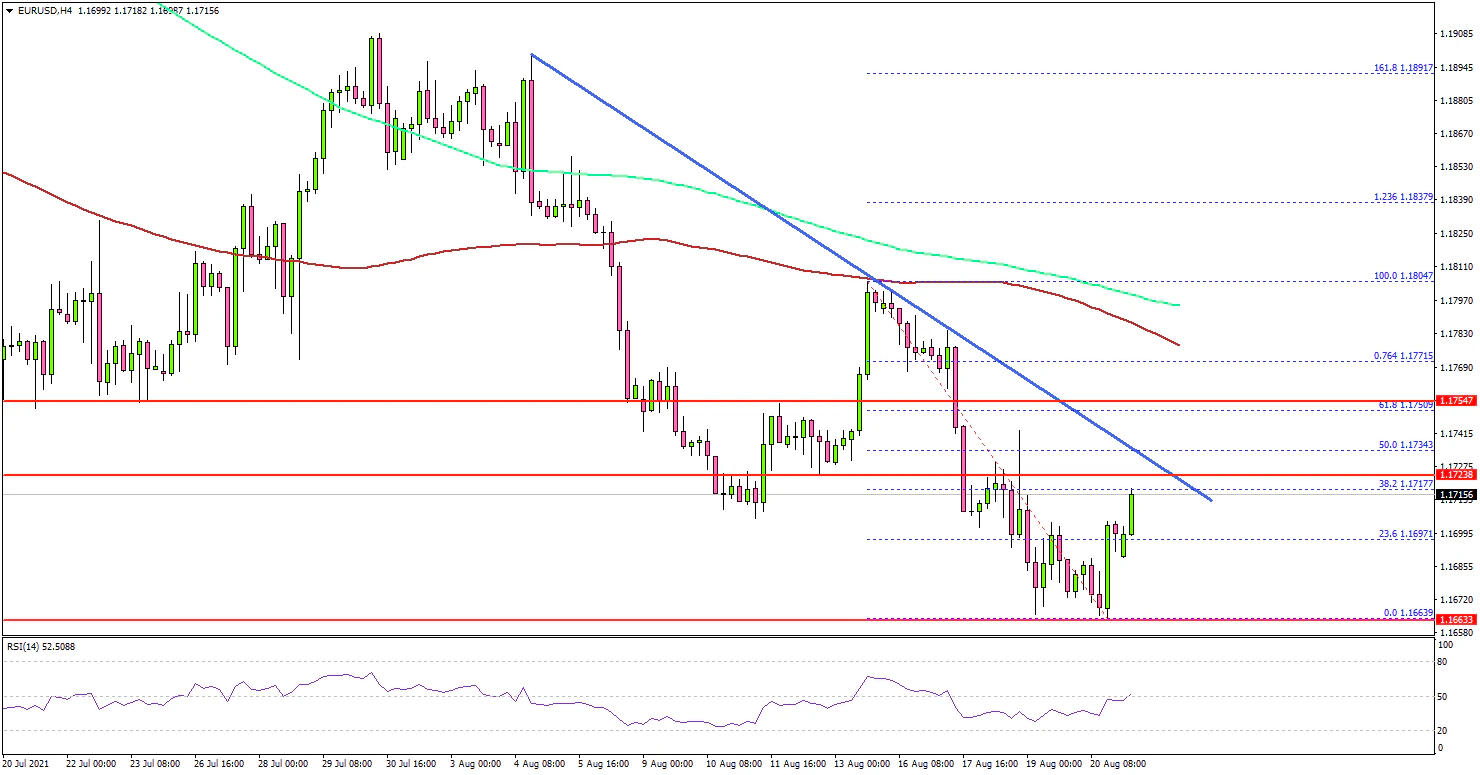 Looking at the 4-hours chart, the pair traded as low as 1.1663. It is now attempting an upside correction above the 1.1680 level. It climbed above the 23.6% Fib retracement level of the downward move from the 1.1804 high to 1.1663 low.