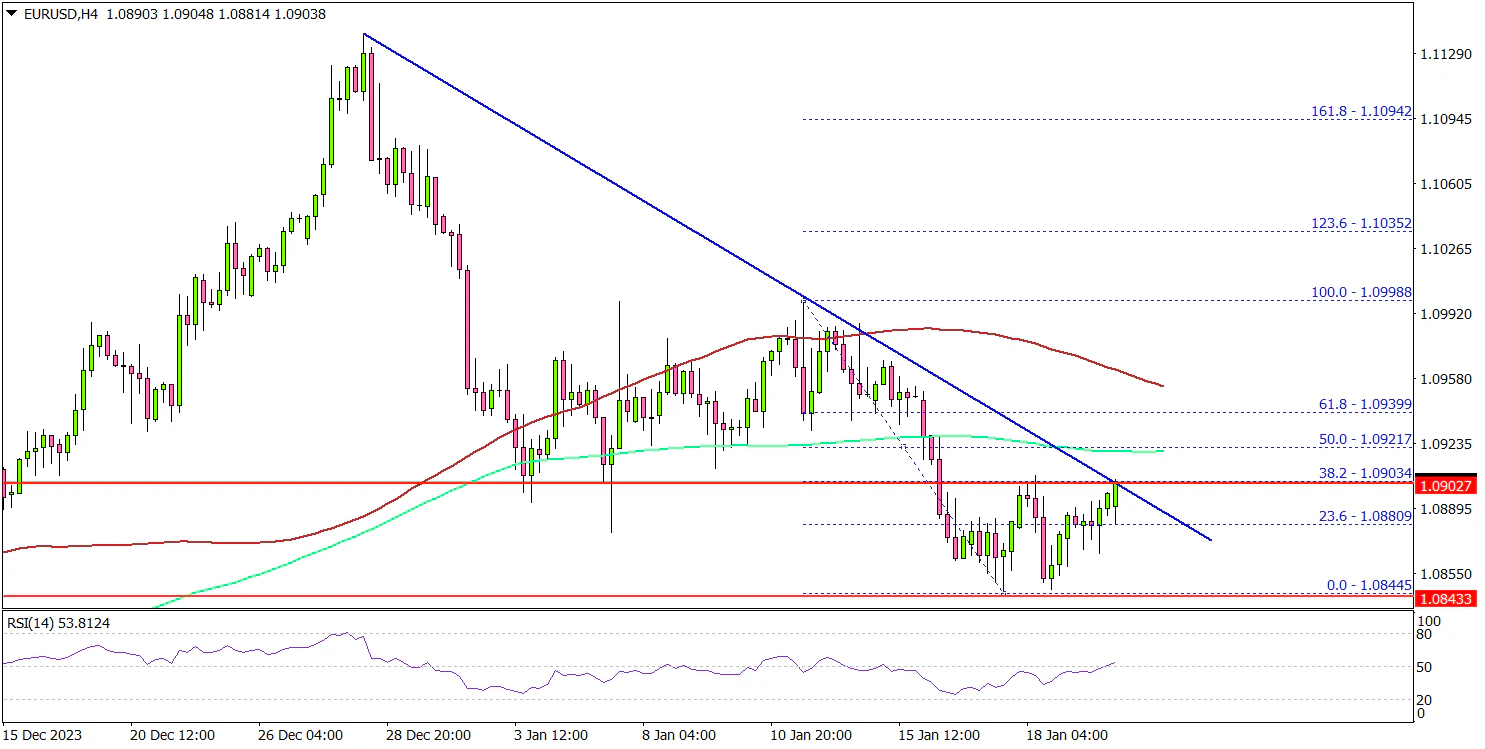 • A key bearish trend line is forming with resistance near 1.0900 on the 4-hour chart.