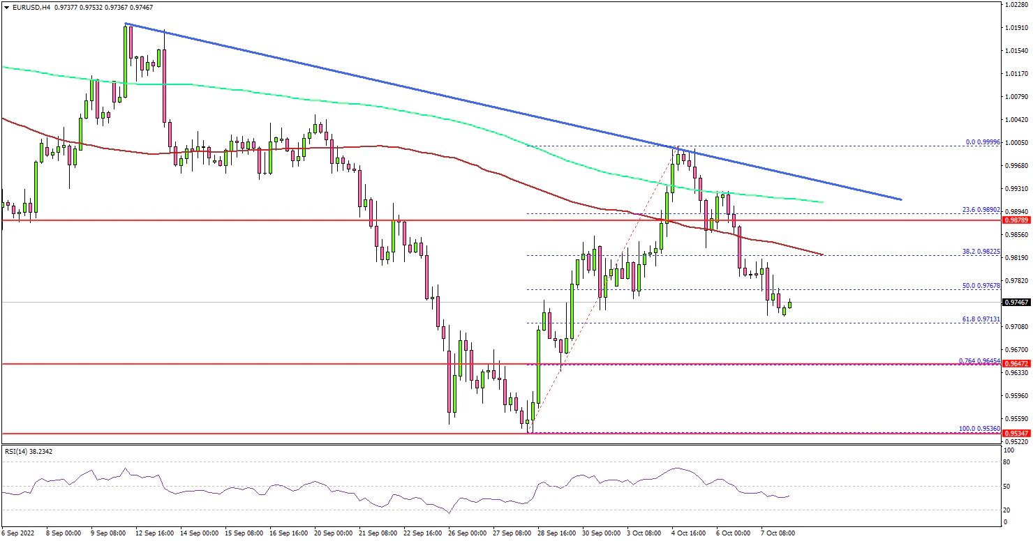 The pair declined below the 50% Fib retracement level of the upward move from the 0.95.36 swing low to 0.9999 high. It even settled below the 0.9850 level, the 100 simple moving average (red, 4-hours), and the 200 simple moving average (green, 4-hours).