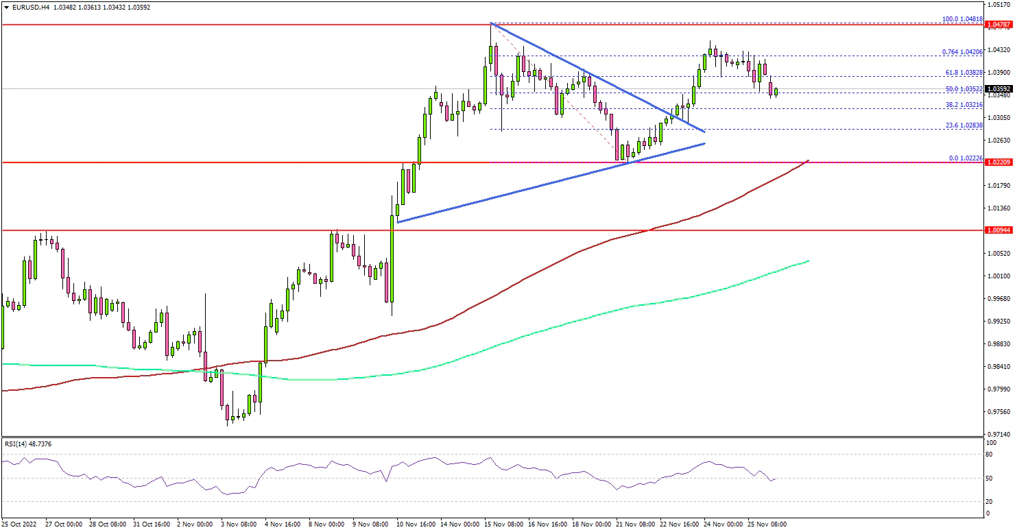 The Euro started a downside correction from 1.0480 against the US Dollar. EUR/USD declined towards 1.0220, where it found support and started a fresh increase.