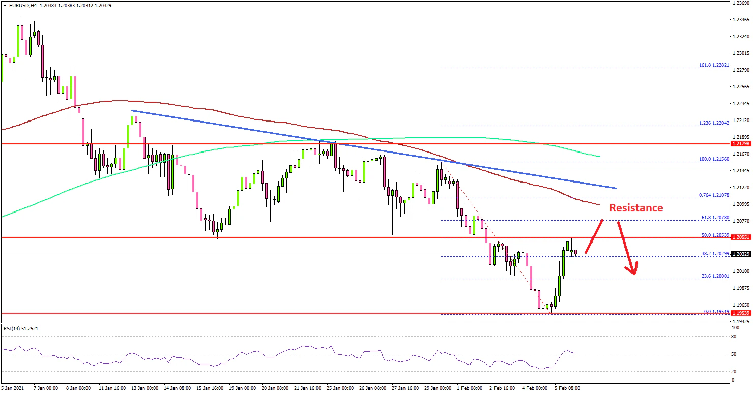 - A key bearish trend line is forming with resistance near 1.2100 on the 4-hours chart.