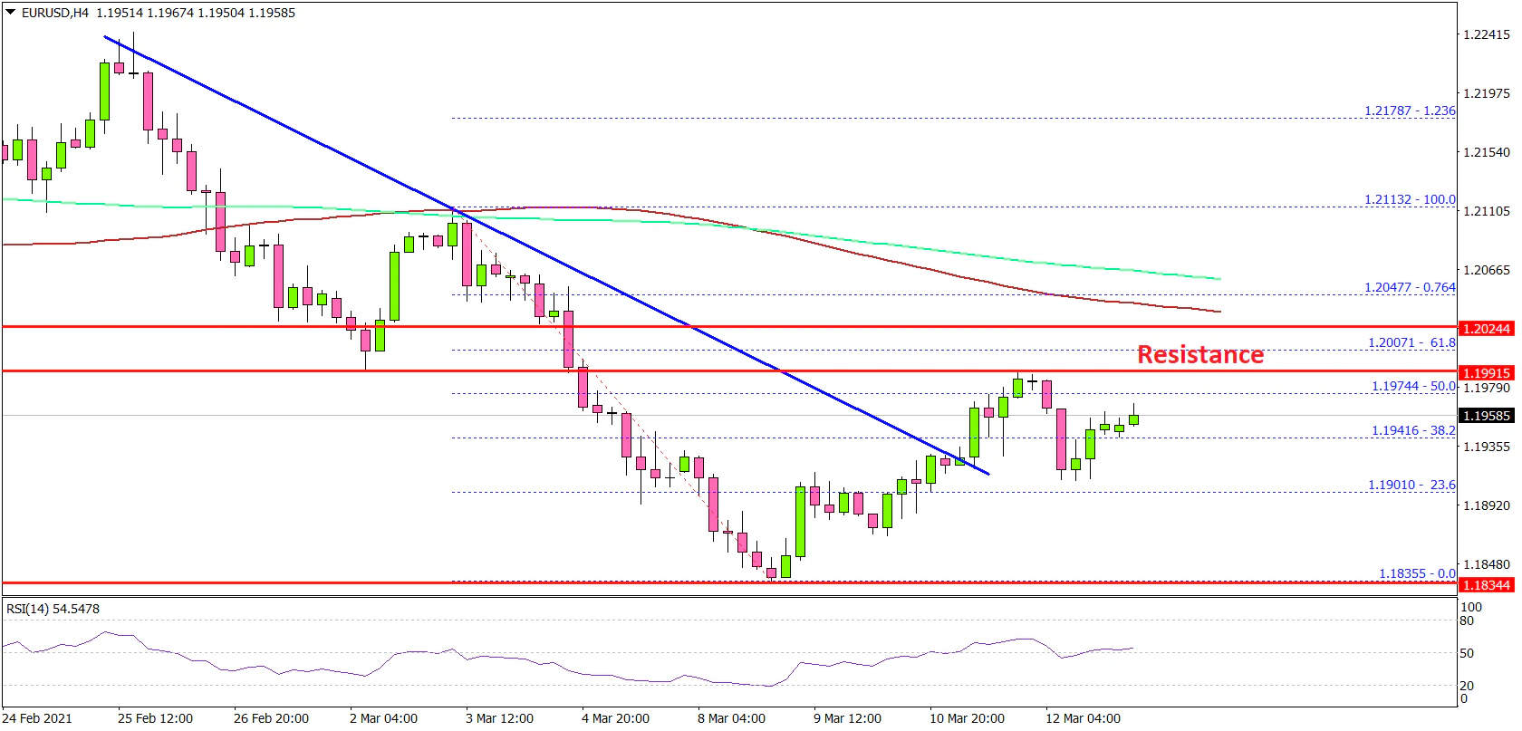 Looking at the 4-hours chart, the pair climbed above the 1.1920 resistance zone. There was also a break above a key bearish trend line at 1.1930 on the same chart. It opened the doors for a move above the 1.1950 resistance.