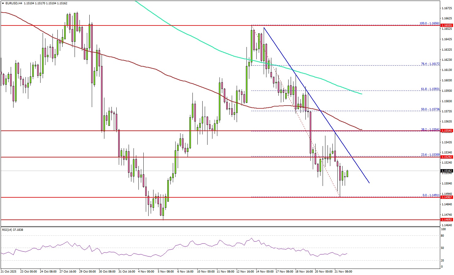 - A bearish trend line is forming with resistance at 1.1530 on the 4-hour chart.