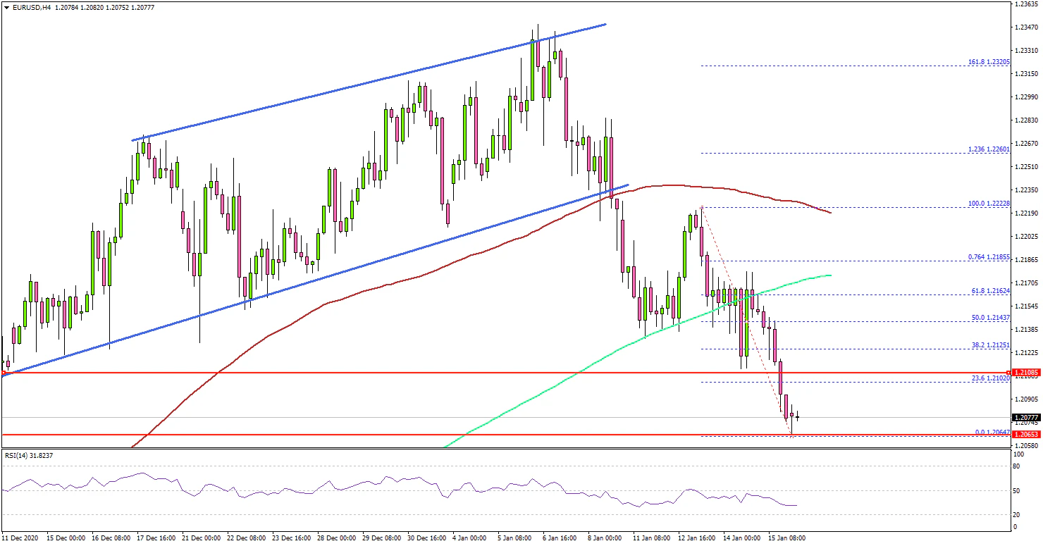 As a result, there was a sharp decline below the 1.2180 level and the 100 simple moving average (red, 4-hours). The pair traded close to the 1.2065 support level and it even broke the 200 simple moving average (green, 4-hours).