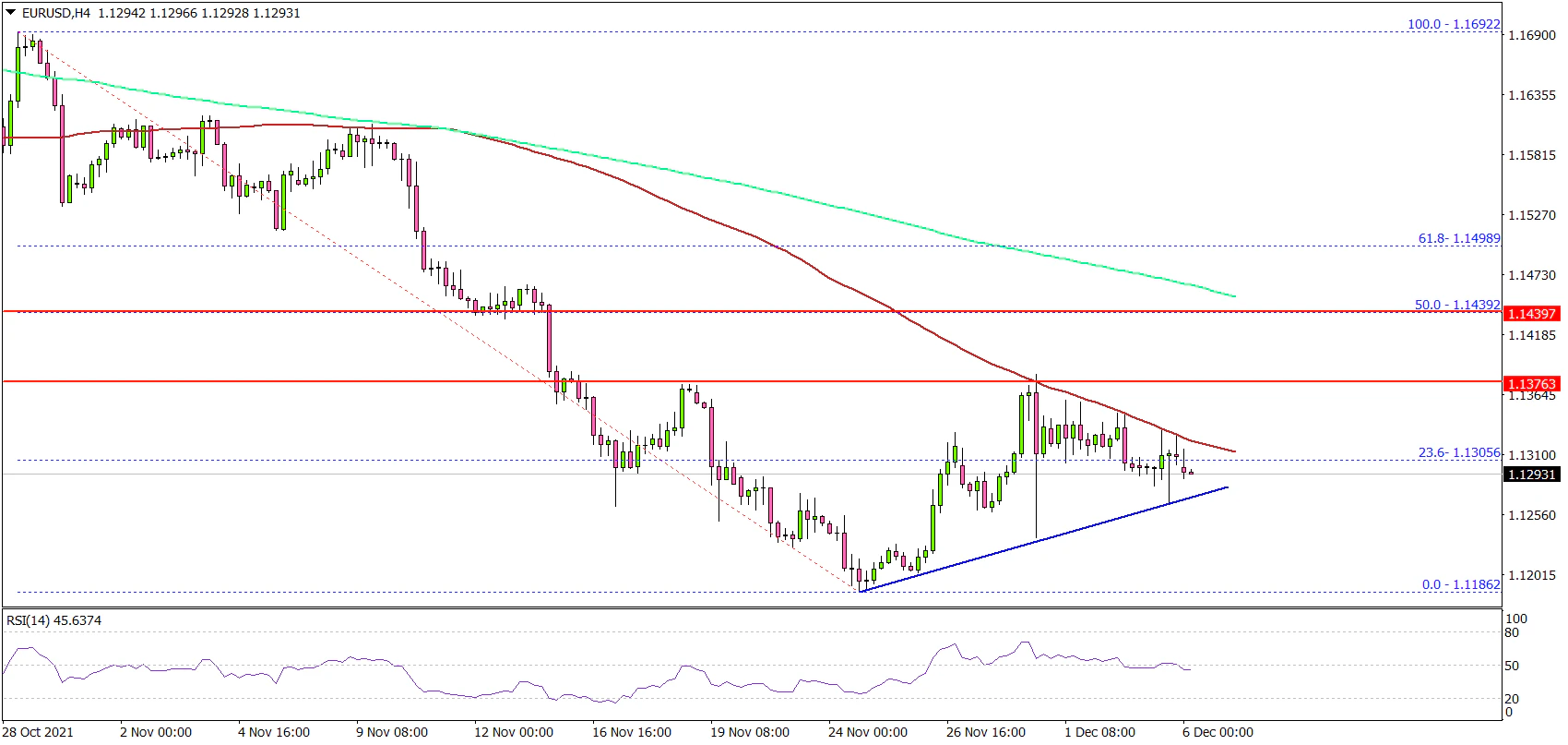 • A key bullish trend line is forming with support near 1.1270 on the 4-hours chart.