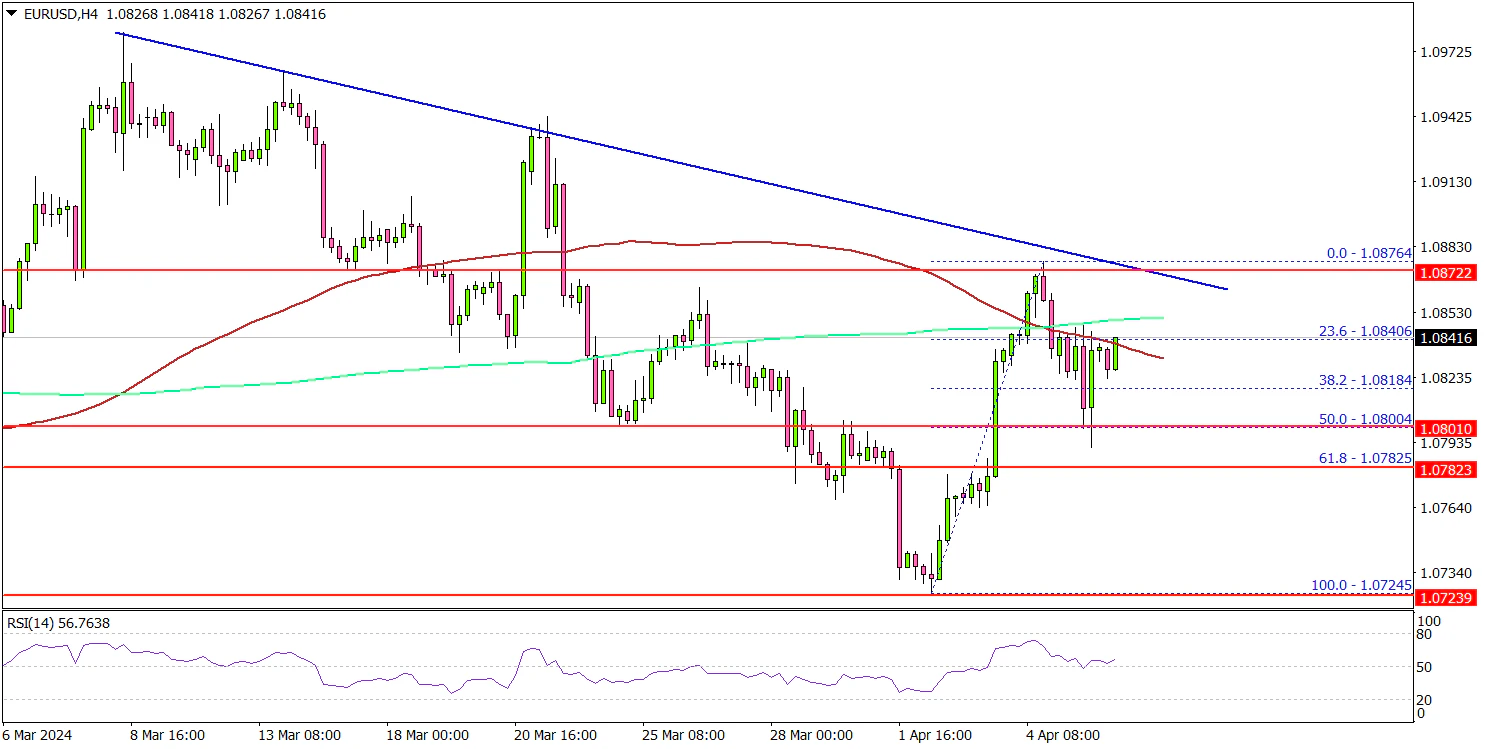 Looking at the 4-hour chart, the pair struggled to clear the 1.0870 and 1.0880 resistance levels. A high was formed near 1.0876 and the pair is now stuck near the 100 simple moving average (red, 4-hour) and the 200 simple moving average (green, 4-hour).