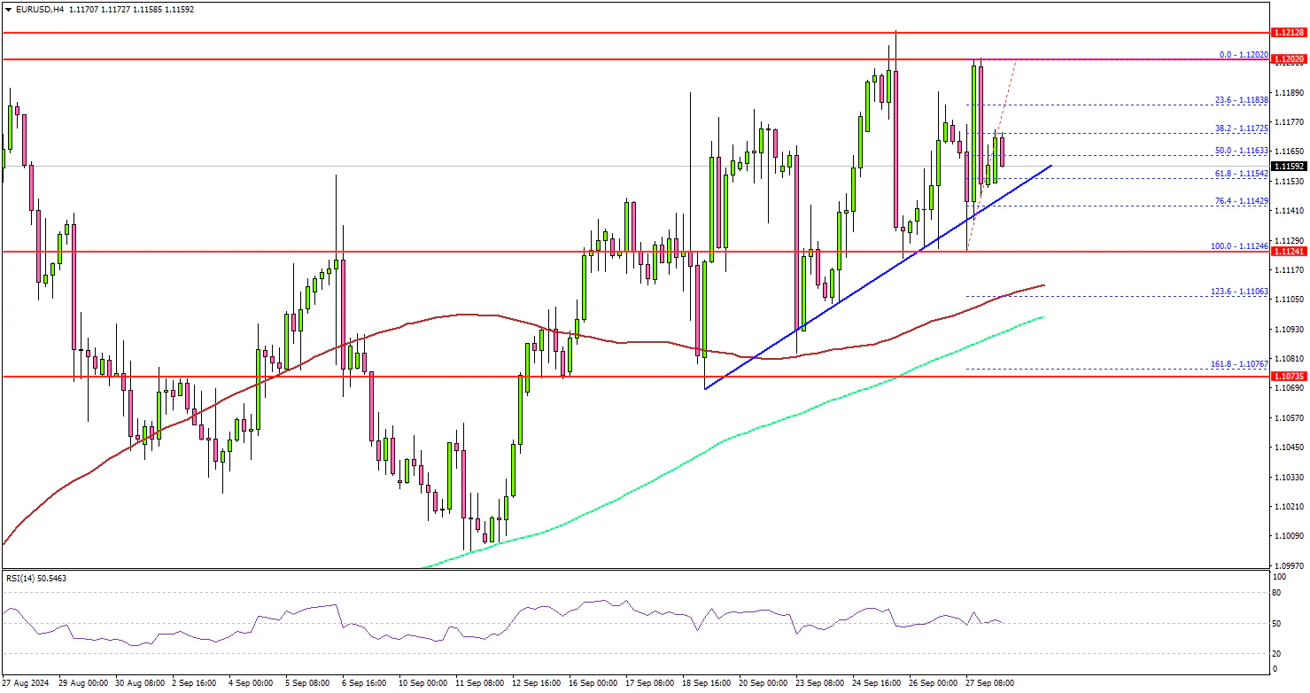 The Euro attempted an upside break above the 1.1200 level against the US Dollar. EUR/USD failed to continue higher and started a consolidation phase.