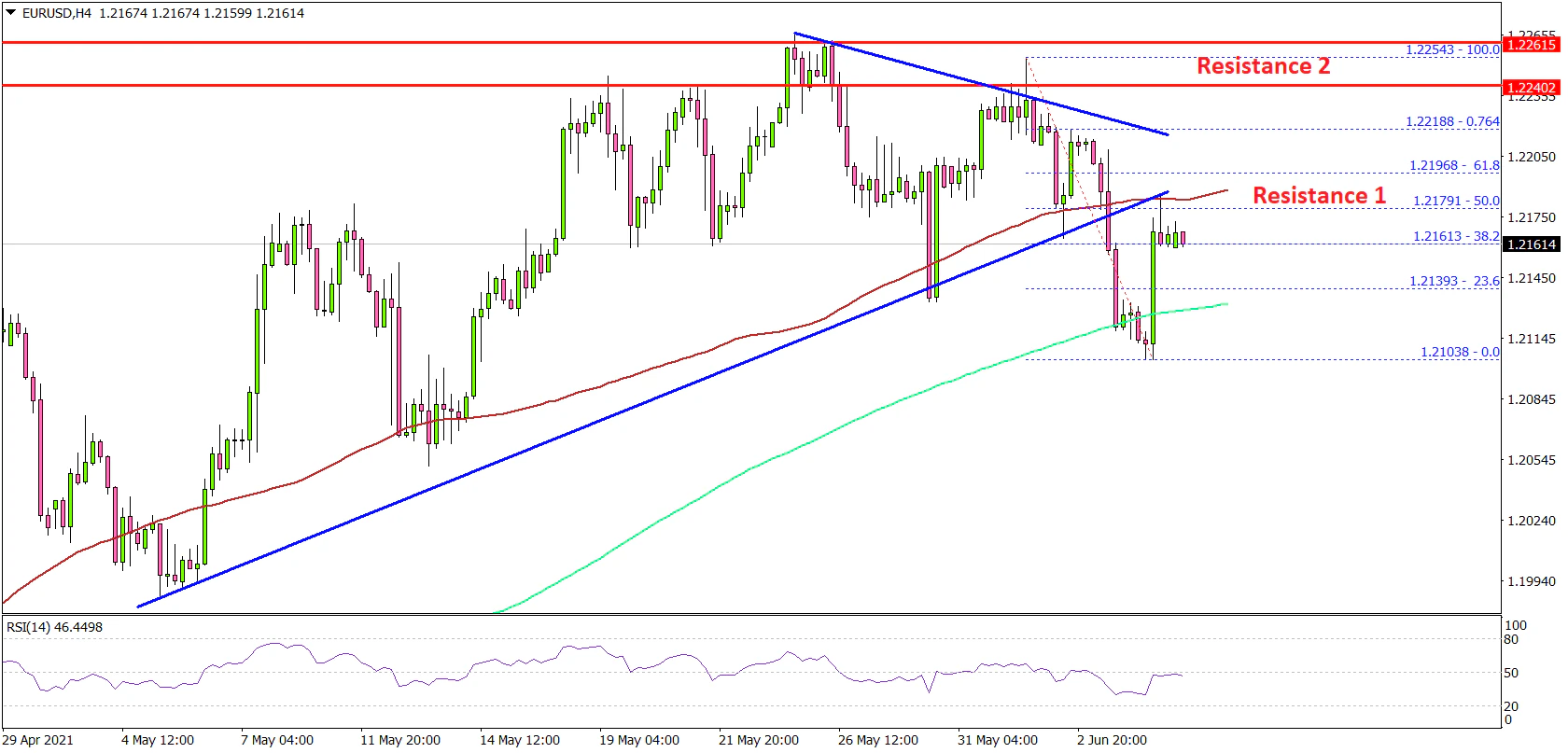- It broke a major bullish trend line forming with support near 1.2175 on the 4-hours chart.