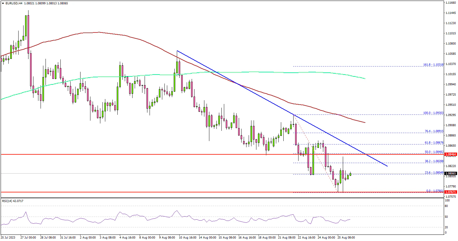 The pair tested the 1.0765 zone. A low is formed near 1.0766 and the pair is now consolidating losses. It is trading just above the 23.6% Fib retracement level of the downward move from the 1.0930 swing high to the 1.07616 low.
