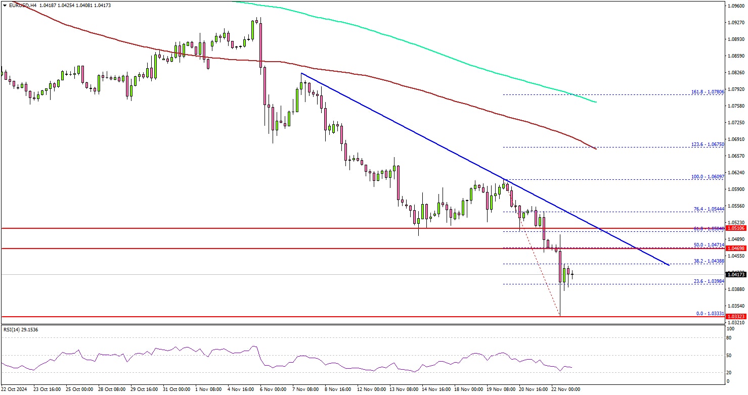 Looking at the 4-hour chart, the pair settled below the 1.0500 support, the 100 simple moving average (red, 4-hour), and the 200 simple moving average (green, 4-hour). It even tested the 1.0335 zone. A low was formed at 1.0333 and the pair is now consolidating losses.