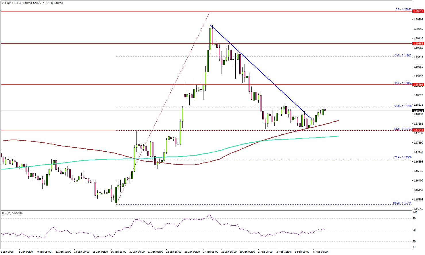 Looking at the 4-hour chart, the pair tested the 61.8% Fib retracement level of the upward move from the 1.1577 swing low to the 1.2082 high. The pair remained stable above the 100 simple moving average (red, 4-hour) and the 200 simple moving average (green, 4-hour).