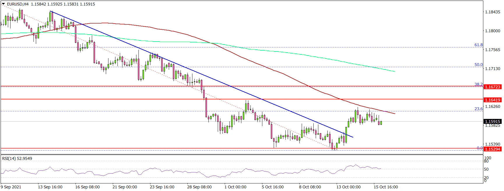 The pair tested the 23.6% Fib retracement level of the downward move from the 1.1908 swing high to 1.1525 low. It seems like the pair faced resistance near 1.1625 and the 100 simple moving average (red, 4-hours).