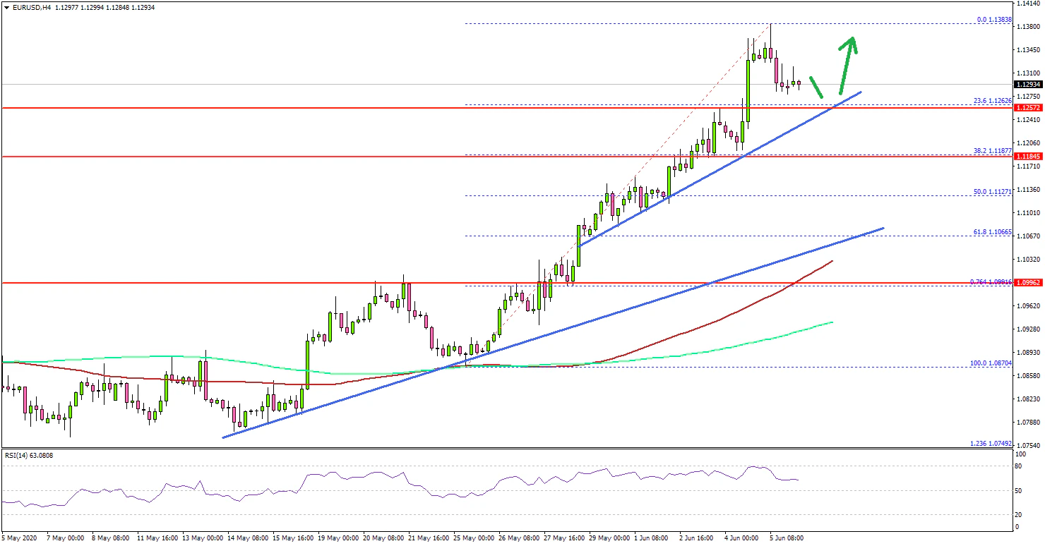 - A key bullish trend line is forming with support near 1.1250 on the 4-hours chart.
