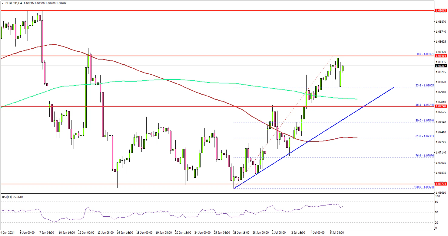 Looking at the 4-hour chart, the pair was able to clear the 1.0780 resistance zone. There was a close above the 100 simple moving average (red, 4-hour) and the 200 simple moving average (green, 4-hour).