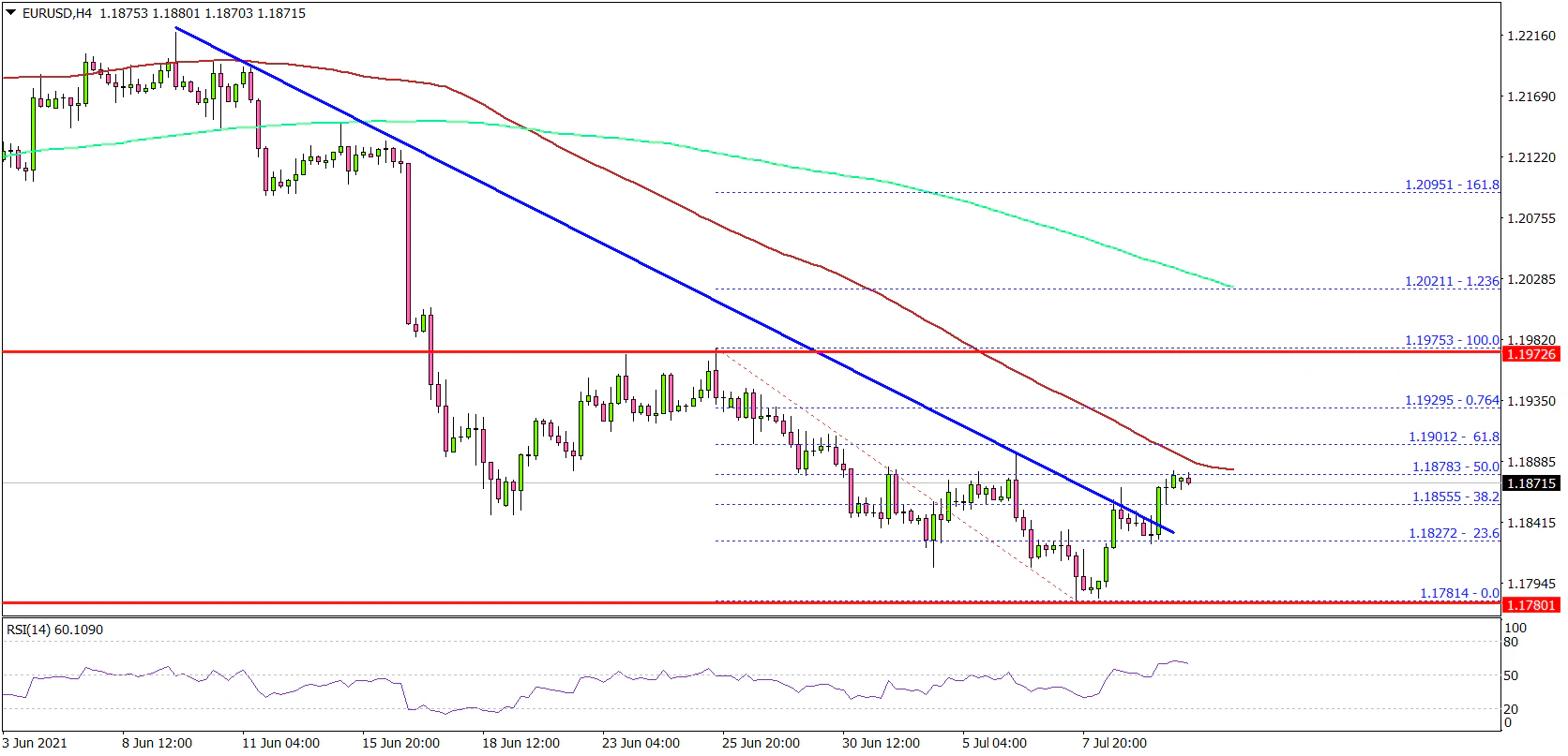 - EUR/USD traded as low as 1.1781 before starting an upside correction.