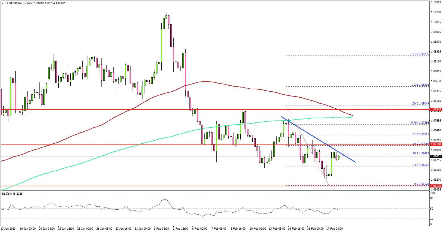 There was a clear move below the 1.0650 support zone. The pair traded as low as 1.0612 and is currently correcting losses. There was a minor increase above the 1.0640 and 1.0650 resistance levels.