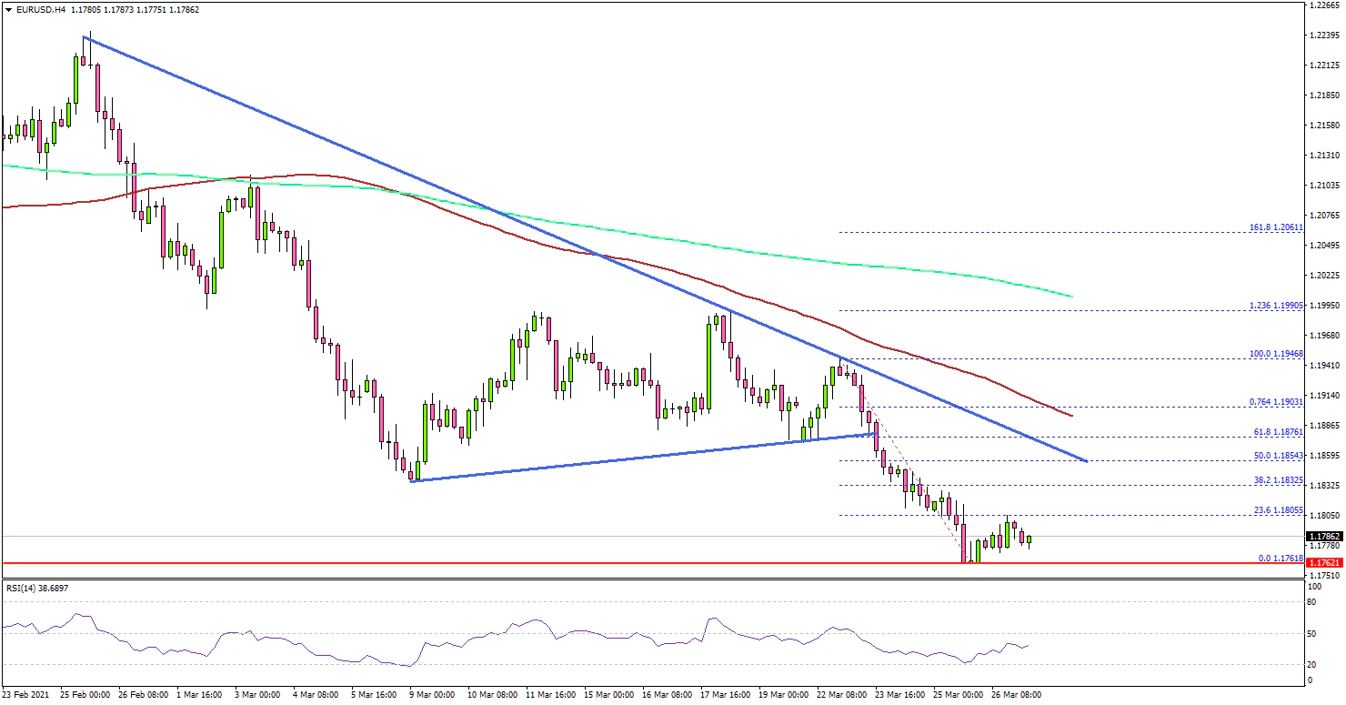 Looking at the 4-hours chart, the pair declined below 1.1800 and traded as low as 1.1761. There was a close below the 1.1850 level, the 100 simple moving average (red, 4-hours), and the 200 simple moving average (green, 4-hours).