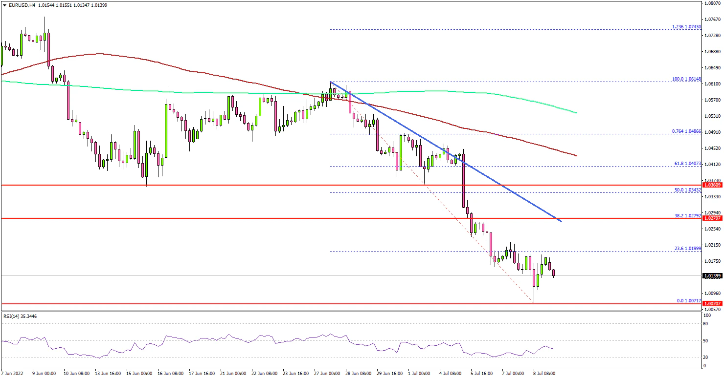 The bears even pushed the pair below the 1.0250 support zone. A low was formed near 1.0071 and the pair started a minor upside correction. It tested the 23.6% Fib retracement level of the downward move from the 1.0614 swing high to 1.0071 low.