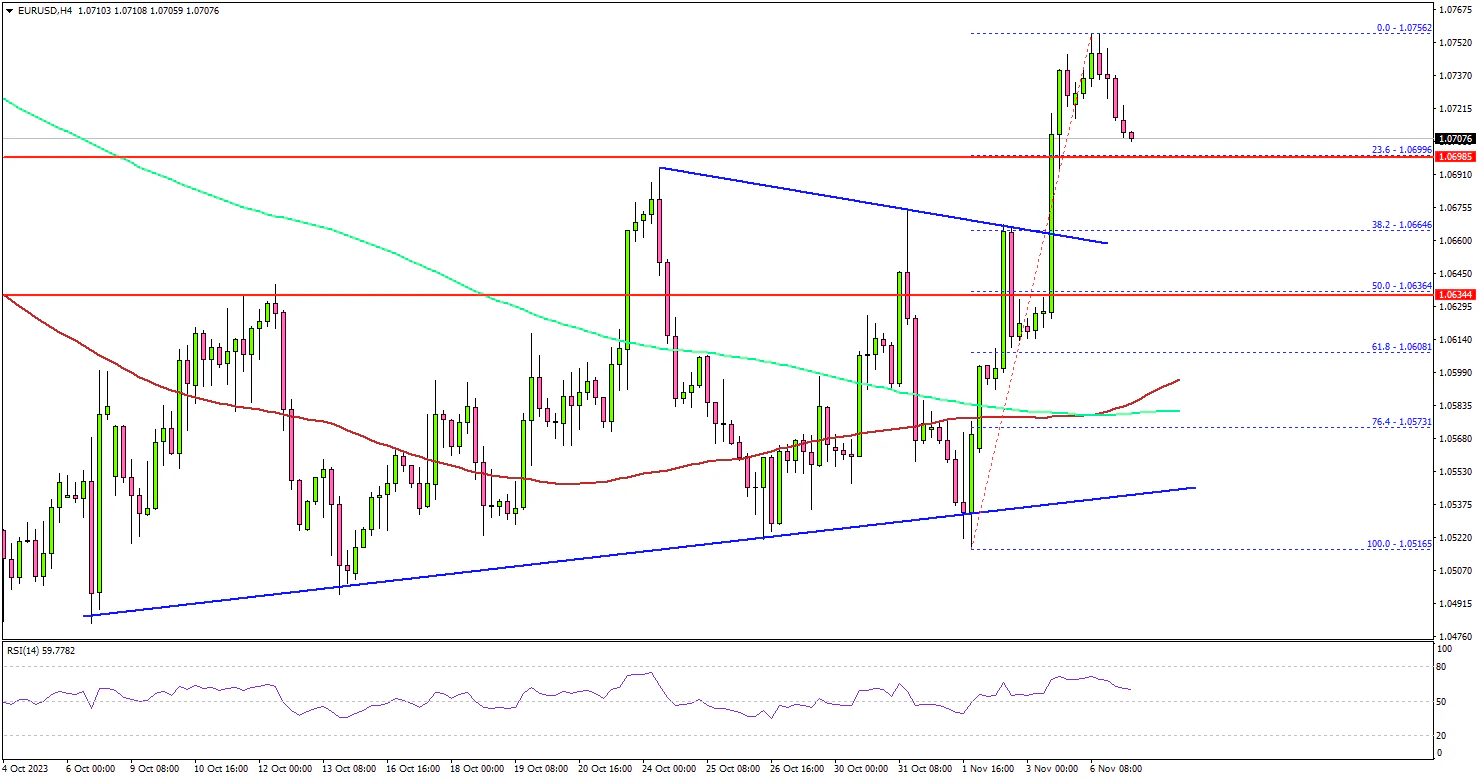 Looking at the 4-hour chart, the pair broke a key contracting triangle with resistance near 1.0665. It even settled above the 1.0700 level, the 100 simple moving average (red, 4 hours), and the 200 simple moving average (green, 4 hours).