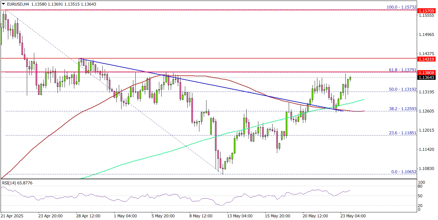 There was a break above the 50% Fib retracement level of the downward move from the 1.1573 swing high to the 1.1065 low. On the upside, the pair could face resistance near the 1.1380 level.