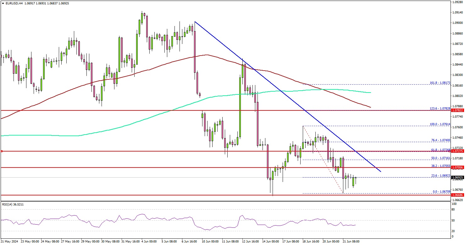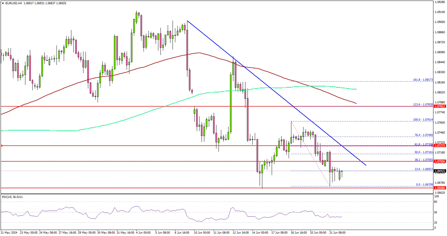 Looking at the 4-hour chart, the pair settled below the 1.0720 level, the 100 simple moving average (red, 4-hour), and the 200 simple moving average (green, 4-hour). It is now consolidating near the 1.0670 support zone.