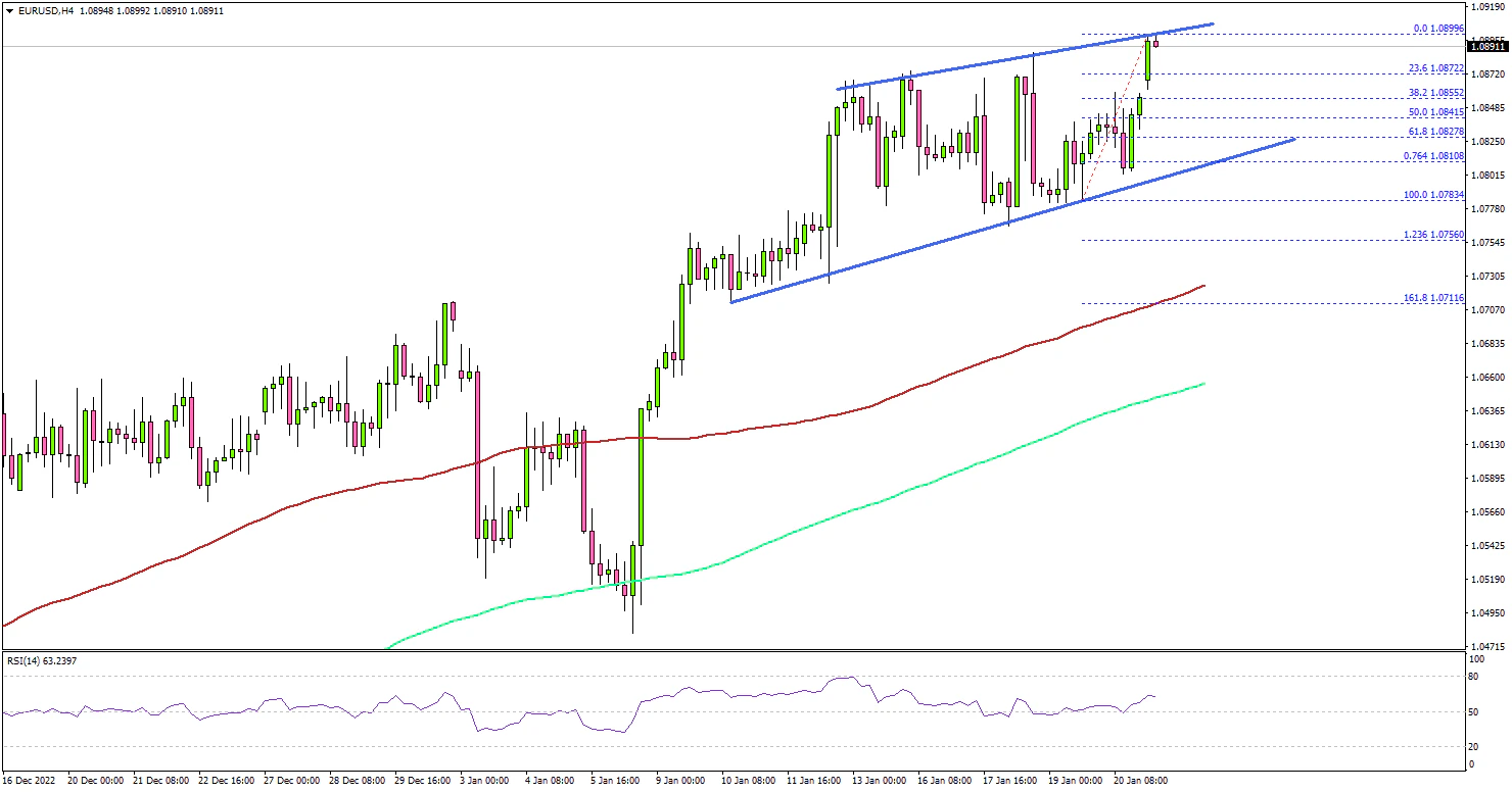 The pair even cleared the 1.0850 resistance and tested the 1.0900 zone. On the upside, an initial resistance is near the 1.0900 level. There is also a key rising channel forming with resistance near 1.0900 on the same chart.