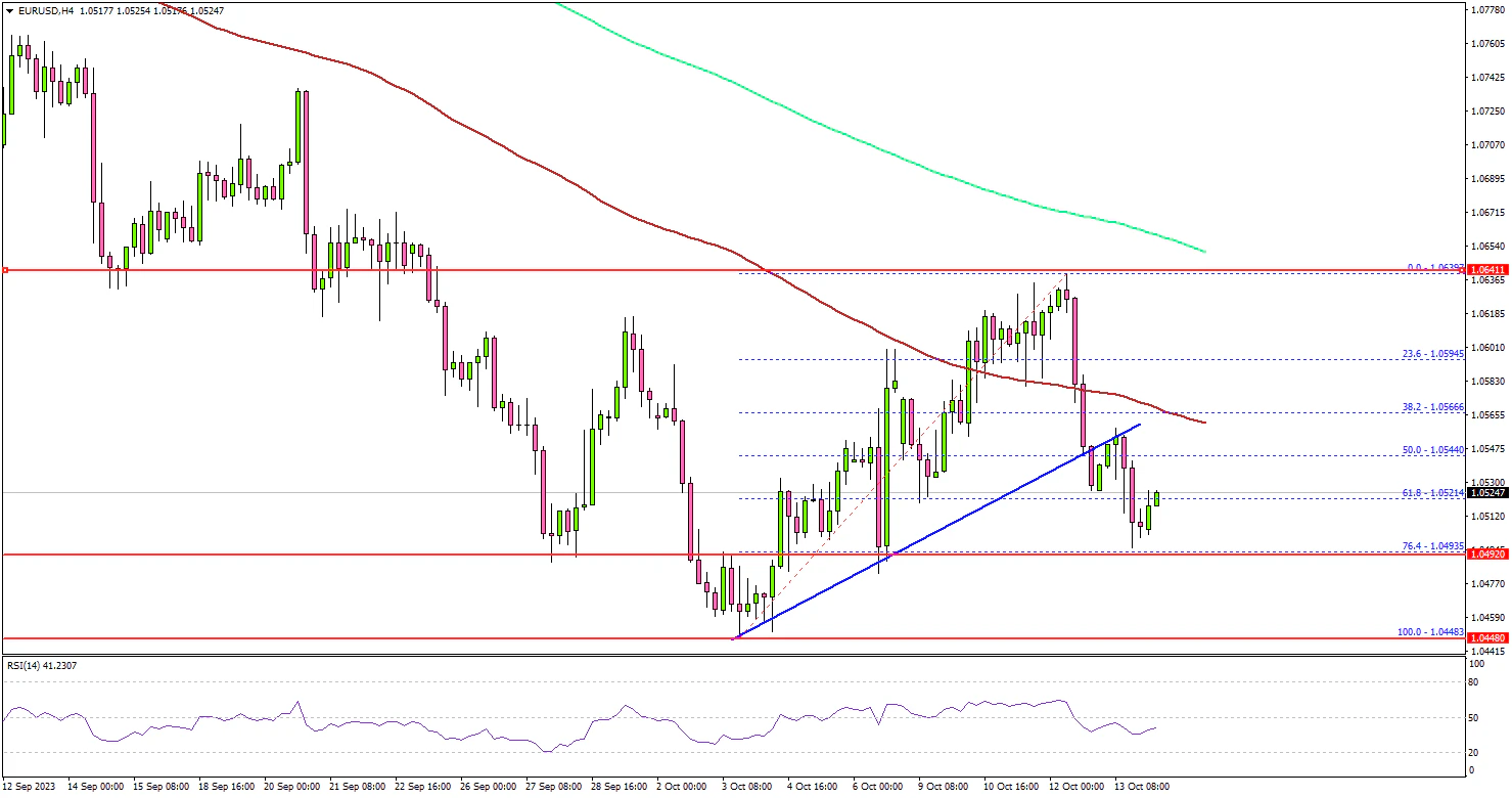 Looking at the 4-hour chart of EUR/USD, the pair declined below the 1.0565 support zone. There was a break below a key bullish trend line with support near 1.0560. The pair even settled below the 1.0550 level, the 100 simple moving average (red, 4 hours), and the 200 simple moving average (green, 4 hours).