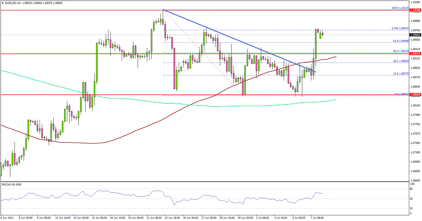 Looking at the 4-hour chart, the pair broke a major bearish trend line with resistance near 1.0890. The pair settled above the 1.0920 resistance, the 200 simple moving average (green, 4 hours), and the 100 simple moving average (red, 4 hours).
