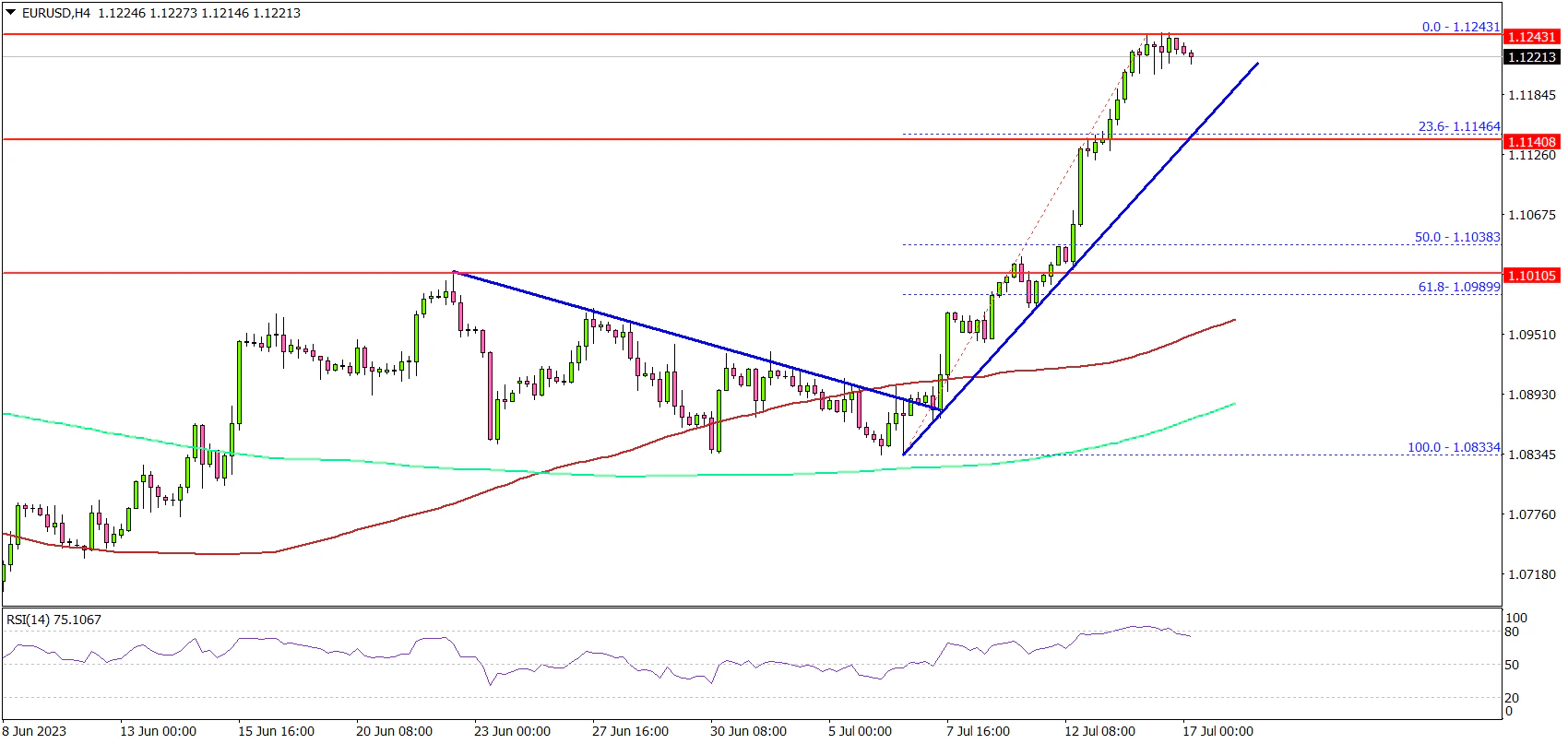 Looking at the 4-hour chart, the pair settled above the 1.1200 level, the 200 simple moving average (green, 4 hours), and the 100 simple moving average (red, 4 hours).