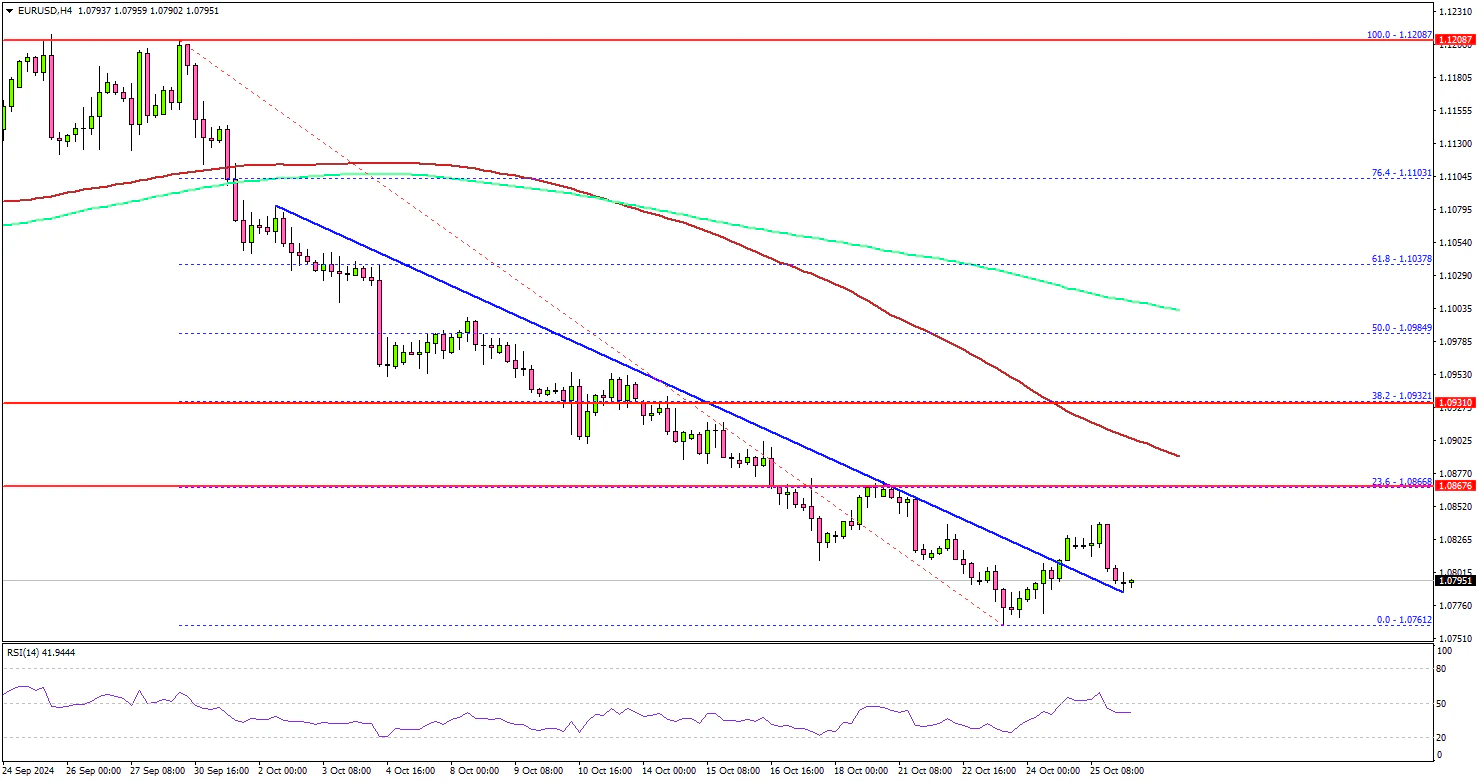 • It attempted a recovery wave above a connecting bearish trend line with resistance at 1.0810 on the 4-hour chart.